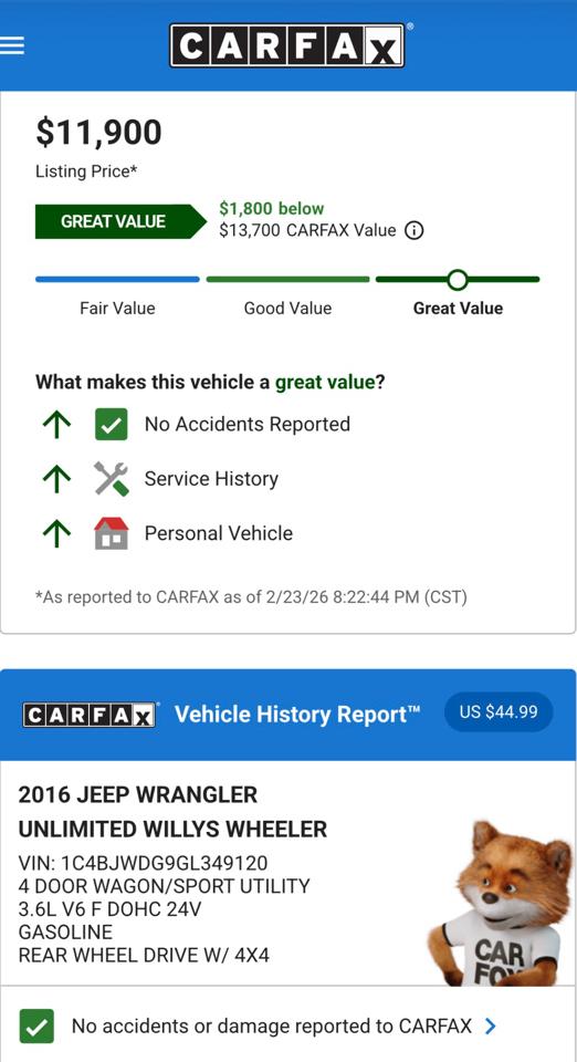 Nice, RUST-FREE Southern Wrangler priced to SELL! 2016 Jeep Wrangler Unlimited Willy's Wheeler 4X4. NO accident history! 3.6 liter 285hp V6 mated to a five speed automatic transmission, ice cold air, power windows and door locks, tilt wheel, cruise control, premium sound system with Bluetooth and USB input, Willy's Wheeler package, three piece hardtop, remote security system with keyless entry and more. 162,580 very well-maintained miles. Finished in solid Black Clearcoat over Black cloth. Looks, runs, and drives GREAT! Please CALL 334-320-3113 for more information. Partial trades plus cash considered. Financing available through third party lenders, but I'm sorry, no in-house financing is available. Stop by and take a look in person at Showcase Automotive, 2217 US Hwy 231 S, Wetumpka, AL 36093 (right next to El Encanto Mexican restaurant) or view our complete inventory 24/7/365 at Showcase-Automotive.com.
